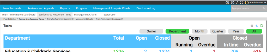 Setting the system up and changing these parameters so that your organisation gets the best out of the service is important. You are aiming to use the table to change and improve behaviour. This FAQ explains how you can set up the parameters and categories for dashboard KPIs including this table and dashboards in general.