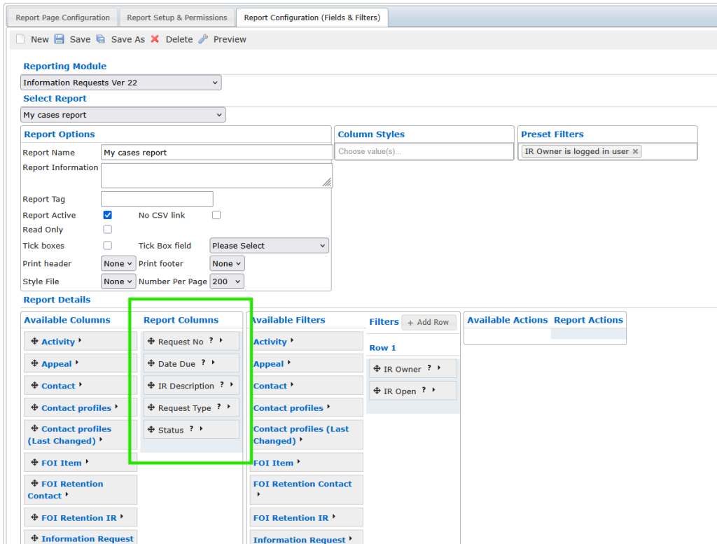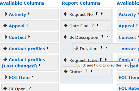 To the left of the “Report Columns” list is “Available Columns” This is a collection of other data boxes each containing the fields (columns) you can choose to add. Hold the “arrowed cross” (a common icon for moving an object) and drag it up to the columns list. You can also order the position of the columns in your Report. The top field (Request Number in this case) will be the first column (left most) in your report. Until you save these latest changes, Status will remain the last (right most) column in your Report.