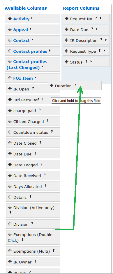 Duration will go wherever you drop it. That includes betweeen other columns. Those field names will move up and down to accomodate the new entry. In the screenshot below, “Duration” is being placed so that it shows in the fourth column of the Report after “IR Description”.